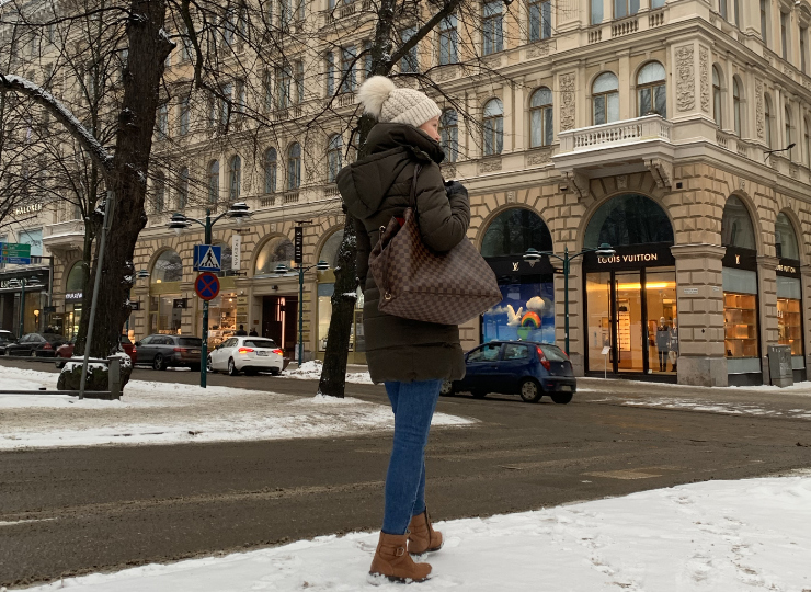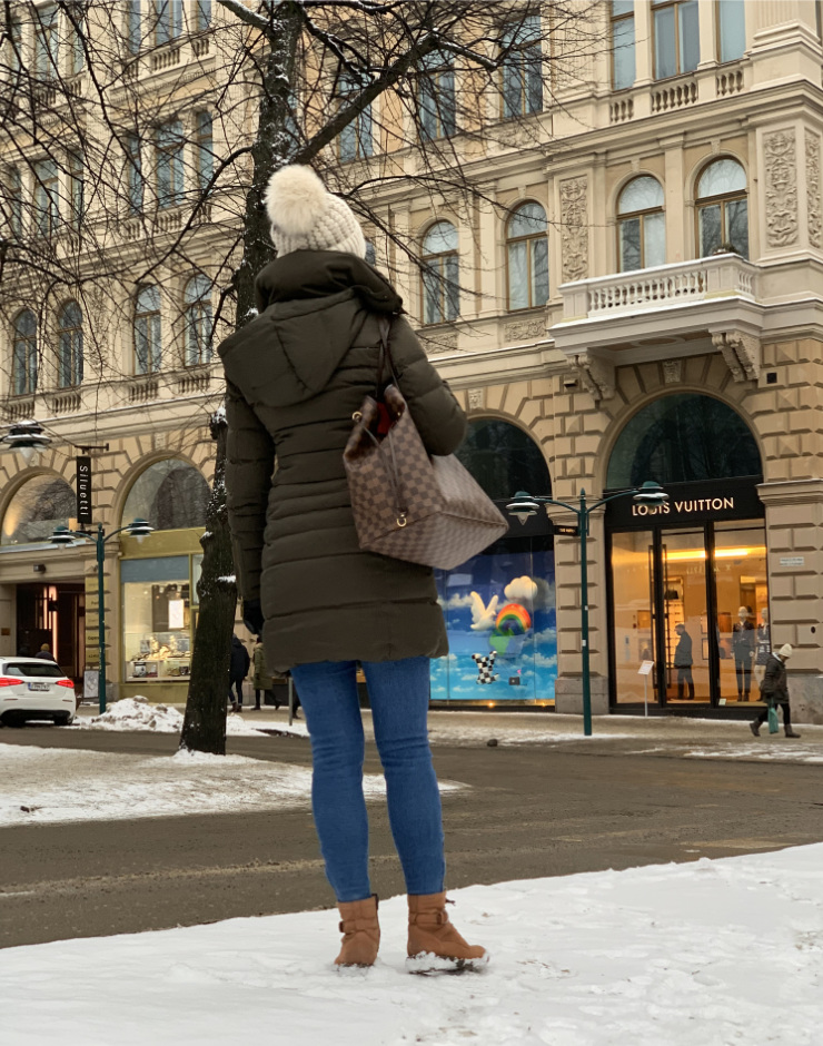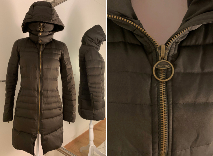 Lauantaikävely Esplanadilla alkoi käymään tukalaksi, kun koin takin olevan liian tiukka, olihan alla vähän paksumpi pusero ja kaulahuivikin. No, nyt tämä kiva Sandin talvitakki saa mennä myyntiin. Jos siis olet siroa kokoa XS/34 tämä takki sopii sinulle. Takki on kauniisti muotoiltu, kuten kuvista näkyy. Väri on sellainen vihertävän ruskea.