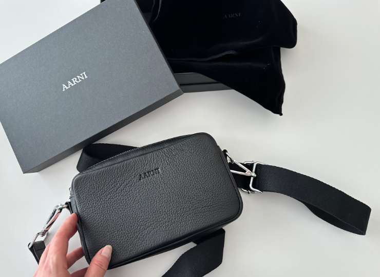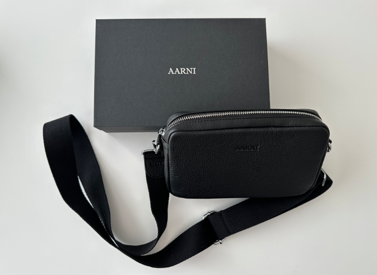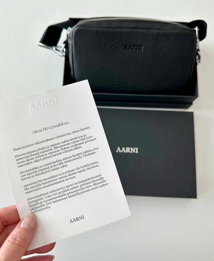Laukulla on suomalainen nimi Aarni. Aarni on yritys, joka tekee myös upeita puukelloja. Aarni-tuotteet ovat kaunista, suomalaista suunnittelua. Tästä hirvennahkalaukusta pitää mainita, että näitä tuotettaessa yhtään hirveä ei kaadeta pelkästään nahan takia, vaan nahka tulee ns. sivutuotteena ja pääsee hyötykäyttöön laukuissa. Tämä on todella hienoa!