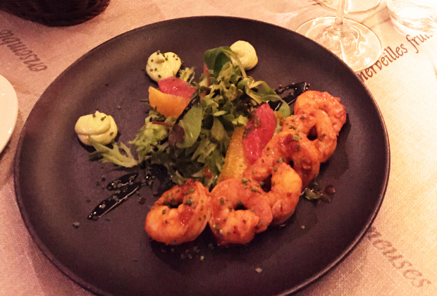Alkuruokana herkuttelin chilillä ja valkosipulilla maustettuja tiikerikatkaravun pyrstöjä yrttiaiolin kera. Niin hyviä ja meheviä että!