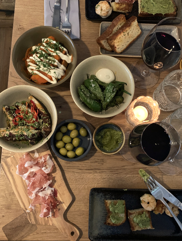 Tapaslistalta maistelimme: marinoituja oliiveja, talon leipää ja hummusta, pimientos de padron eli paahdettuja vihreitä paprikoita, patatas bravas eli friteerattua perunaa salsa brava -kastikkeella ja aiolilla höystettynä, jamon serranoa eli ilmakuivattua kinkkua, Iberico porsaan ribsejä, sekä Pil Pil eli valkosipulilöljyssä kuumennettuja katkarapuja. Tätä listaa kirjoittaessa alankin jo miltei maistamaan suussani maukkaat katkaravut ja herkulliset perunat juuri sopivasti chilillä maustettuna.