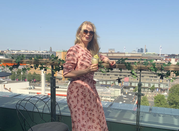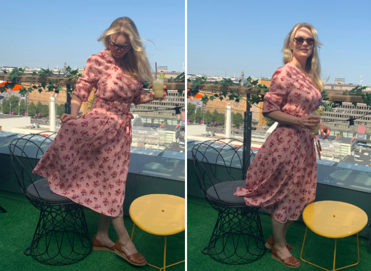 Ihanan kesäpäivän asuksi olin valinnut roosan eli vaaleanpunaisen ruusun sävyisen kukkakuvioisen mekon. Helteisen päivän päätteeksi tässä kevyessä mekossa oli mukava nauttia pari viilentävää cocktailia ja hieman pikkupurtavaakin.