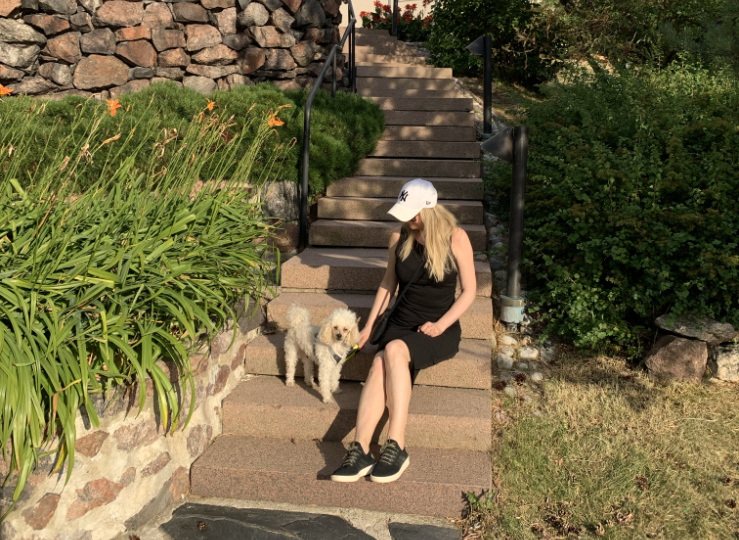 Kävelyasun tyylinä sporty chic. Päälläni rento musta trikoomekko, jonka sivussa olevalla nauhalla saa vyötäröä rypytettyä kivasti. Auringolta suojasi valkoinen Yankees-lippis ja mustat Ray Ban Erica -aurinkolasit. Jaloissa kevyet Adidaksen Court Adapt -tennarit.