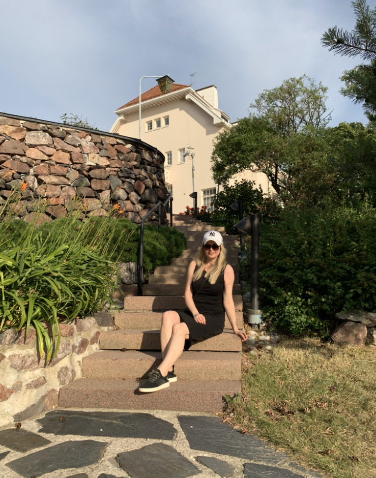 Viileä kesä vaatii pukeutumista sen mukaan. Tällä kertaa, vaikka aurinko paistoi, niin Ulla-myrskyn jälkimainingeissa oli laitettava mekon päälle takki. Olin valinnut päälleni pitkähihaisen pantterimekon, mutta pitkät hihat eivät kuitenkaan suojanneet tarpeeksi viileältä tuulelta. Päädyin laittamaan päälle vielä luottovaatteen eli mustan, biker-tyylisen nahkatakin. Kenkinä niin ikään biker-tyyliset nilkkurit.