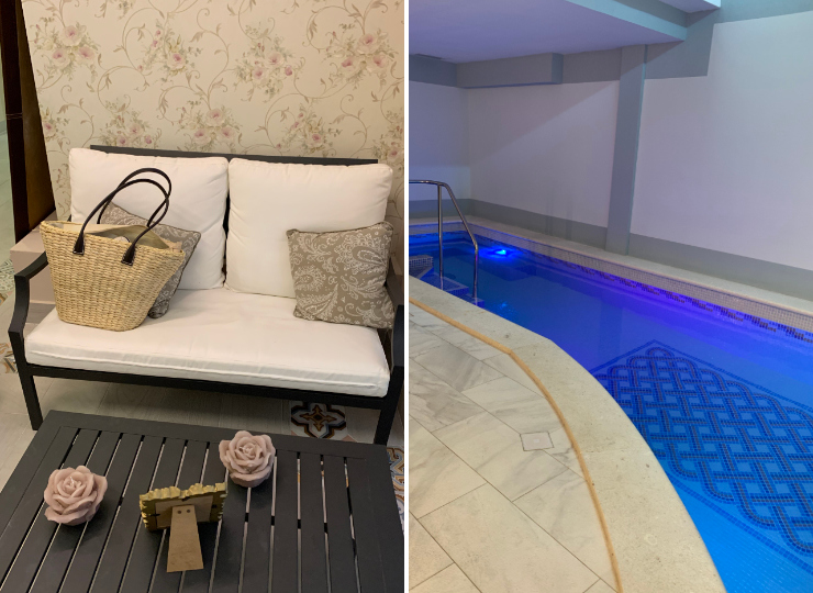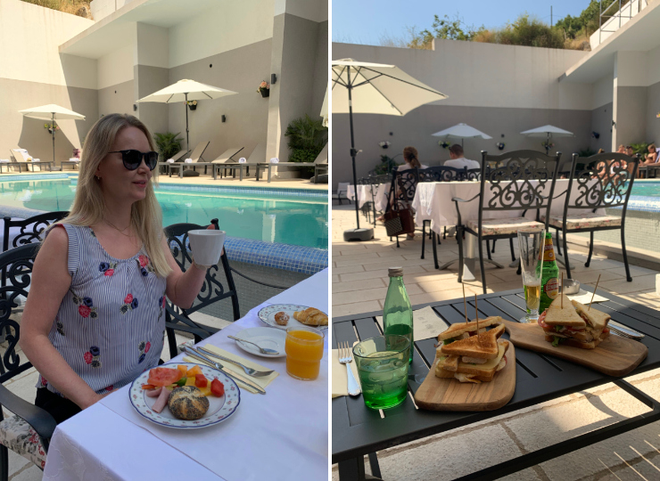 Hotellin ulkouima-allas oli ihana! Uima-allasalue toimi myös hotellin ravintola-alueena. Huoneen hintaan kuuluvan monipuolisen aamiaisen sai nauttia joko sisätiloissa tai ulkona uima-altaan vieressä. Päiväsaikaan uima-altaan reunoille tuotiin aurinkotuolit, juomia ja lounasta tarjoiltiin, ja kun aurinko laski, ulkotila muuttui viihtyisäksi ravintolaksi. Ja mikään tylsä hotellin ravintola ei todellakaan ollut kysessä! Kokki pisti parastaan, ruoka oli herkullista, miljöö rauhallinen ja viihtyisä. Ruokien hinnat eivät päätä huimanneet ja juomat olivat hyviä.
