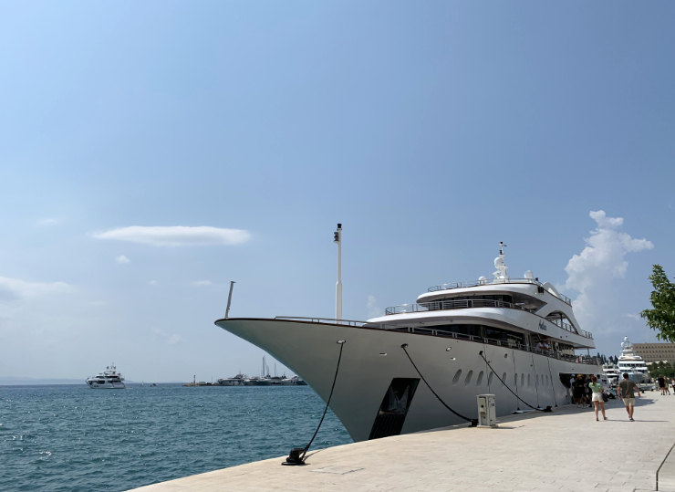 Kävelymatkaa Marjan kukkulalla sijaitsevasta hotellista Splitin keskustan kulmille on siinä 1,5-2km ja hyväkuntoisina reippailijoina ajattelimme sen olevan pikainen kävelymatka. Lämpötila oli ehtinyt nousta 31:een celsiusasteeseen ja auringon porotuksessa sehän on jo nelisenkymmentä astetta kuumuutta. Eipä siinä mitään, hiukset hikiseen niskaan liimautuneena saavutimme rinteen alapuolella olevan keskustan, ostimme pikkukaupasta mehujäätelöt viilentyäksemme ja joimme pullolliset vettä. Ensivaikutelma veden äärellä olevasta, auringon hehkua heijastavasta kaupungista oli hyvä, rannassa olevat jahdit korostivat lomatunnelmaa.