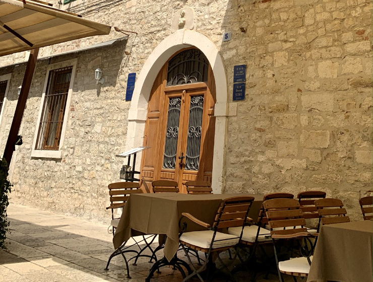 Etsimme paria ravintolaa, joihin suunnittelimme tutustuvamme. Pyörimme pitkin historiallisen keskustan kujia ja aukioita, kunnes ihan vahingoissa kurkistin eräästä kulmauksesta ja siellähän se olikin, Splitin toiseksi parhaaksi valittu ravintola, jossa käyminen oli minulla ollut juuri mielessä. Hikipisarat otsalla pääsimme aurinkovarjon alla olevaan pöytään ja ensitöiksi tilasimme ison pullon vettä ja kylmät oluet.