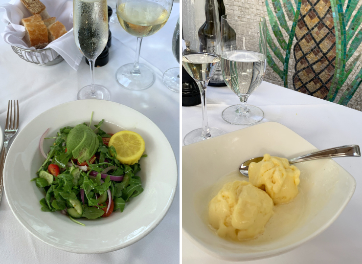 Gianni’s alkupalasalaatti ja jälkiruokasorbetti.Molemmat herkullisia!