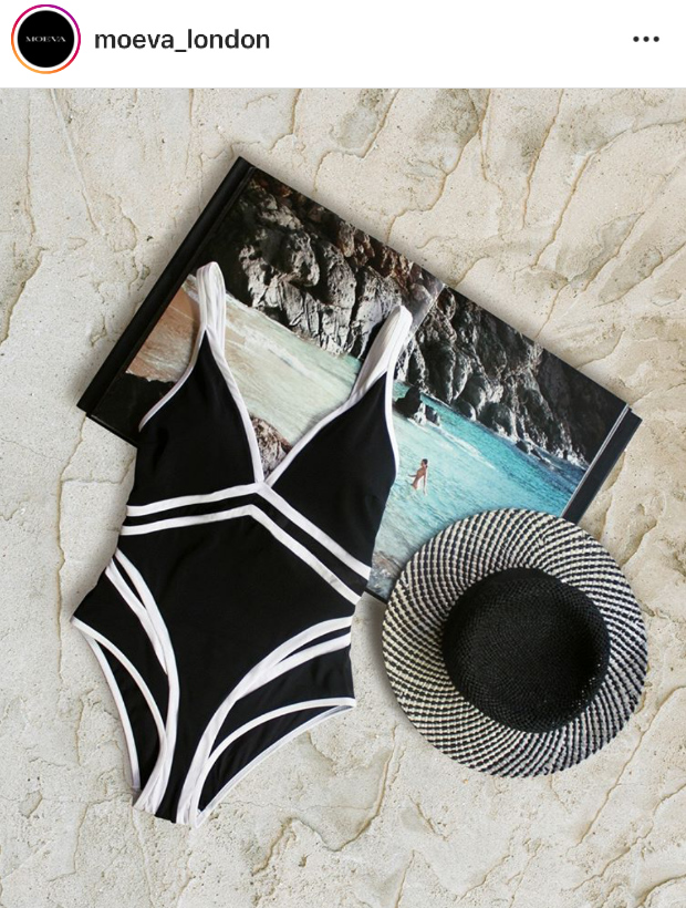 Sporttisuutta peliin mustavalkoisella uimapuvulla, jonka kaksivärisyys ja raidat tuovat mieleen urheiluauton sähäkkyyden.