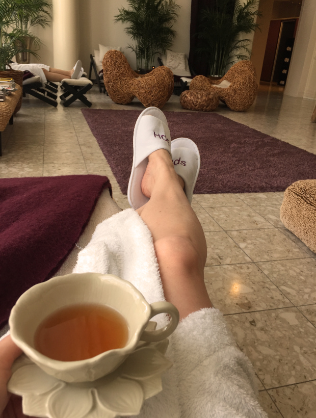 Ennen hoitoa vaihdoin vaatteeni kylpytakkiin ja siirryin loungen puolelle. Ehdin nauttia kupin ihanan makuista marjateetä ennen kuin minut haettiin varaamalle ajalleni jalkahoitoon.