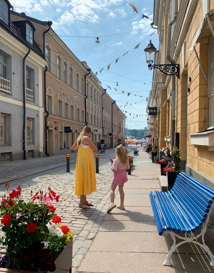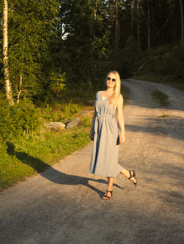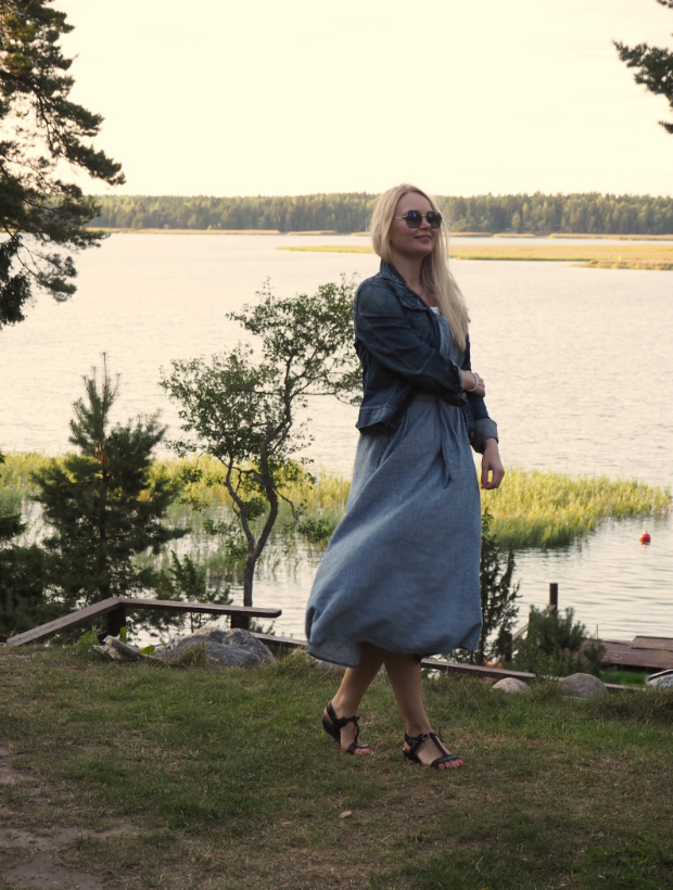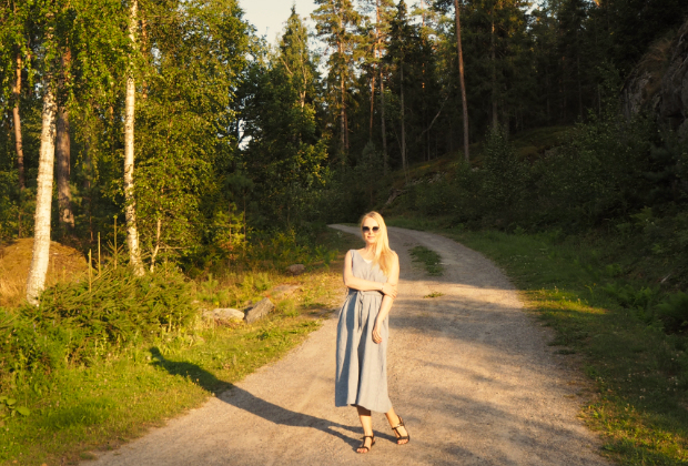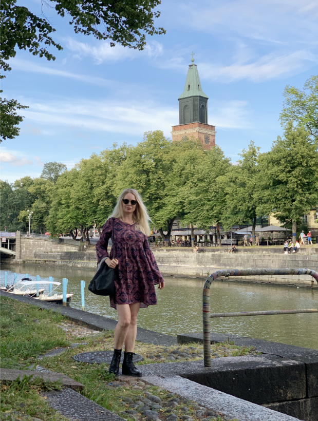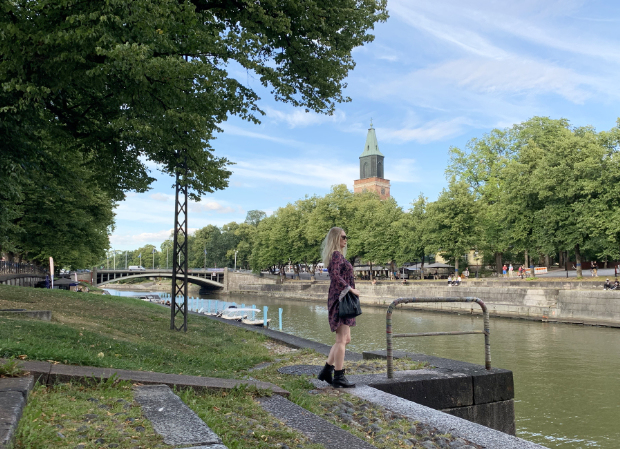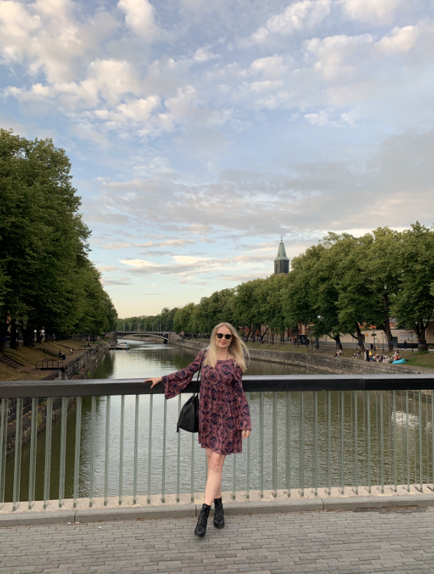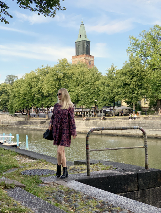 Elokuun muotia: mekko ja maiharit Aurajoen varrella.