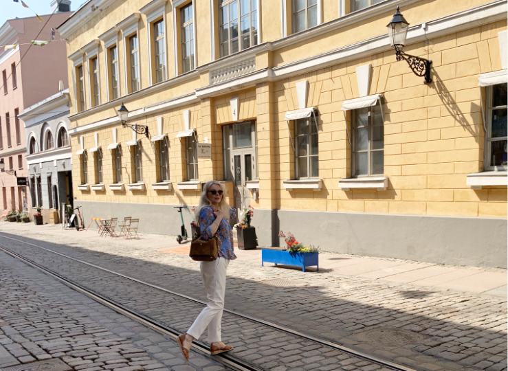 Poikkesimme Helsingin Torikortteleiden Katariinankadulla, missä kulki harvakseltaan raitiovaunu ja jokunen jalankulkija.