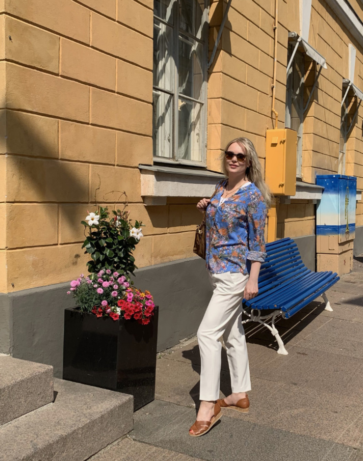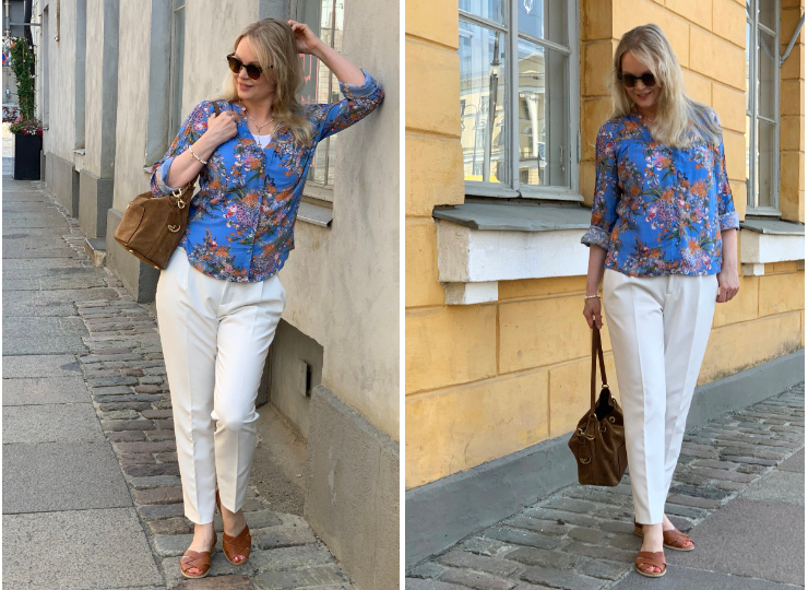 Sunday morning in the quiet city. This cornflower blue shirt is a perfect summer shirt, fabric is light and the flower print can’t be more summery. My favourite bag in the summer months is this suede bucket bag from Michael Kors. Years old but still very fashionable, I think.