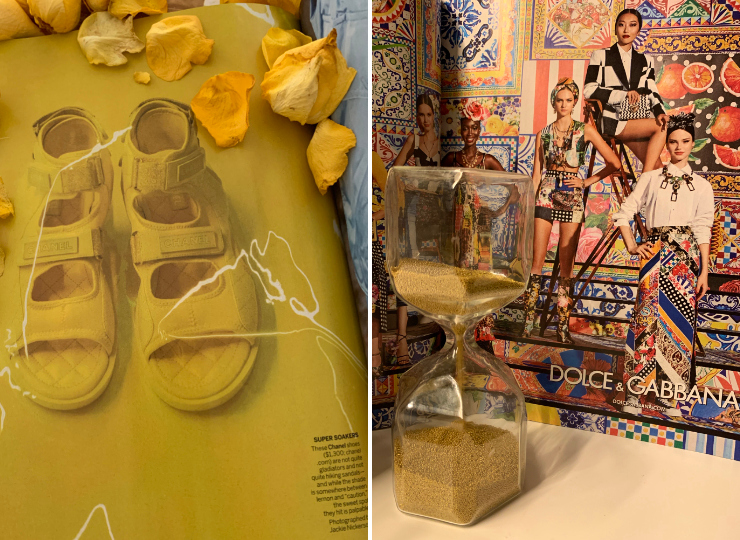 Countdown to Spring Fashion. US Vogue March 2021.Lemony yellow Chanel sandals. Dolce & Gabbana ad.