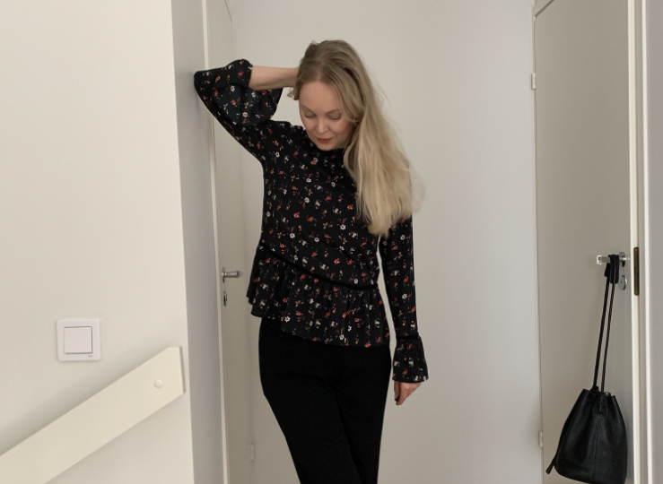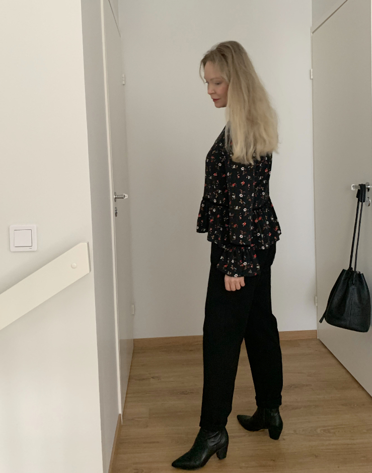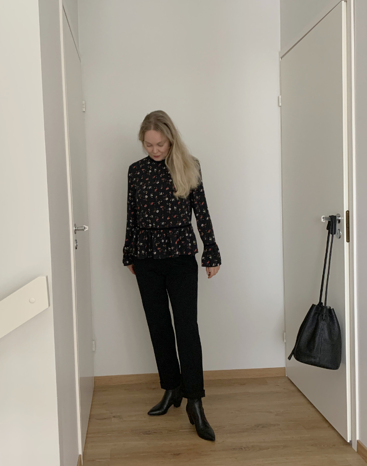 Joku voisi ajatella ettei musta sovi kevääseen, mutta kun tämän asun päälle pukee ulos lähtiessä vaalean villakangastakin, asusta tulee heti raikkaampi. Tämä on minun kevättyyliä 2021.
