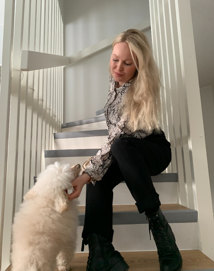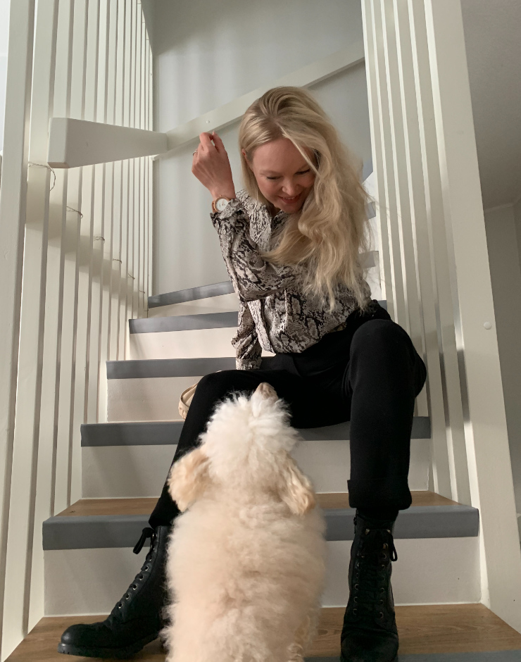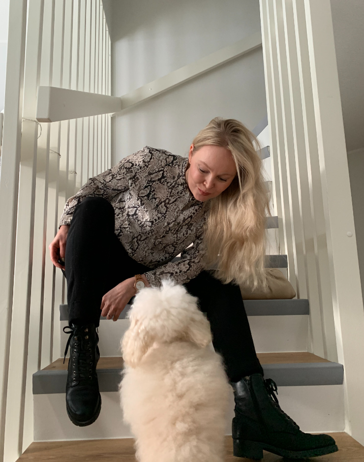 Asukuvissa käärmeprinttiä. Neutraalissa värimaailmassa mateleva paitapusero on sopivan ohutta kangasta, jonka saa hyvin housunkauluksen sisäpuolelle. Mustat housut ovat korkeavyötäröiset, joten vyölle löytyy sopiva ja luonnollinen paikka vyötäröltä. Erilaisilla vöillä saakin somistettua nämä housut kivasti. Tällä kertaa valitsin vyöksikin käärmeprinttiä.