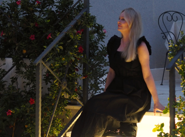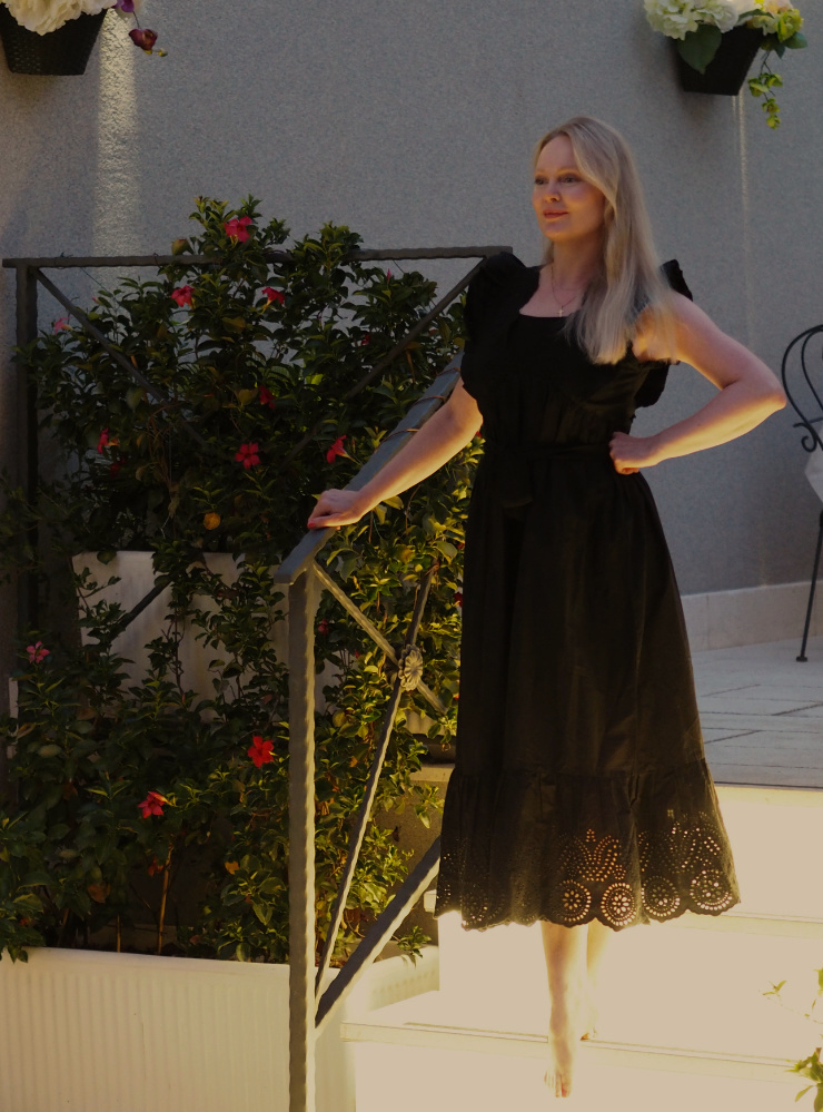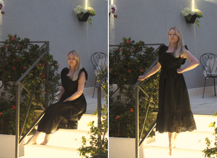 Mangon musta kesämekko illallisasuna. Olen hieman muokannut tätä mekkoa siitä millainen se oli kaupassa. Tässä oli ostettaessa isot puhvihihat, joiden runsaudesta en oikein pitänyt. Koska muuten pidin mekosta, niin päätin näyttää sille vähän saksia. Leikkasin puhvihihat pois, käänsin ja ompelin reunat, jottei kangas repsottaisi.