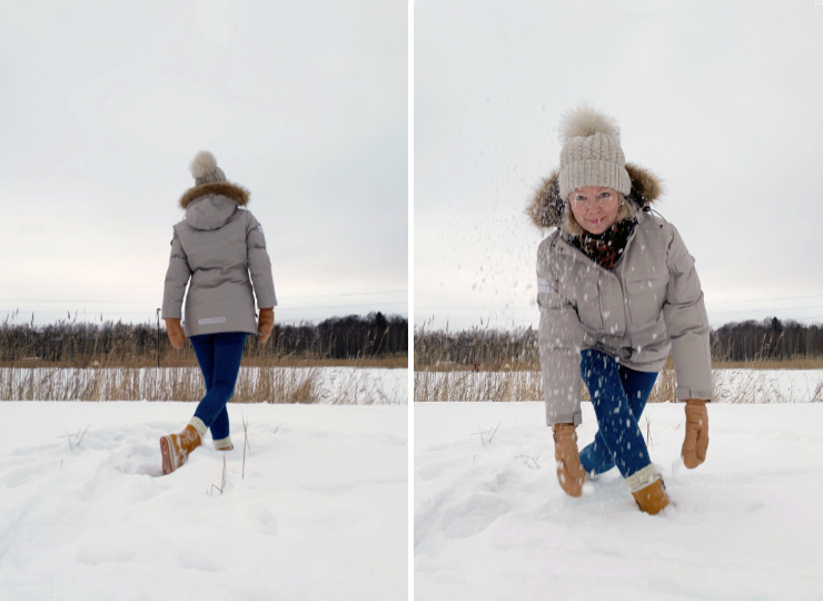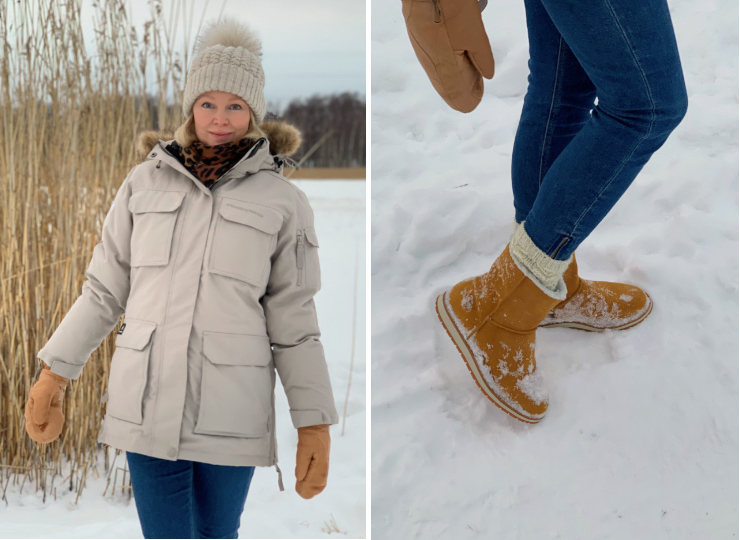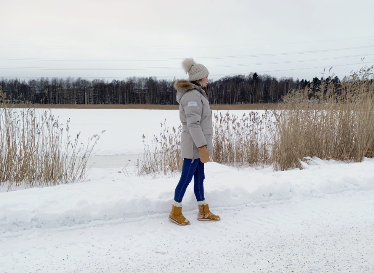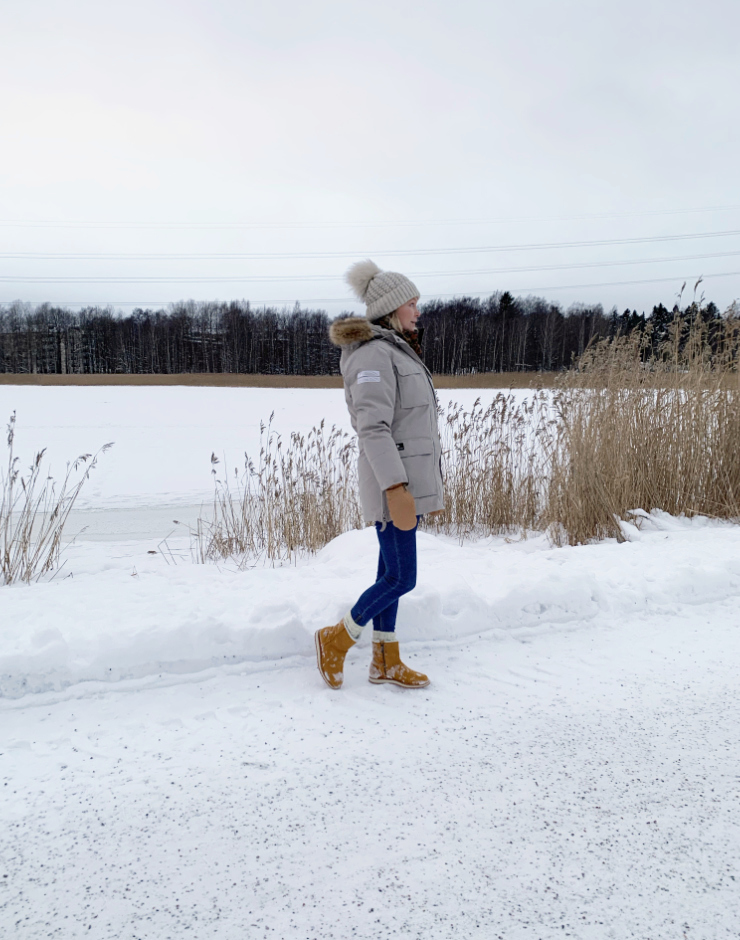 Talvipäivä ja talviasu. Ajatukseni on, että tässä säässä ulkoillessa ei niinkään tarvitse hienostella. Tärkeää on pitää itsensä lämpimänä ja askel varmana. Liukastumista välttääkseen matalapohjaiset ja liukumattomat kengät on kauden parhain valinta.